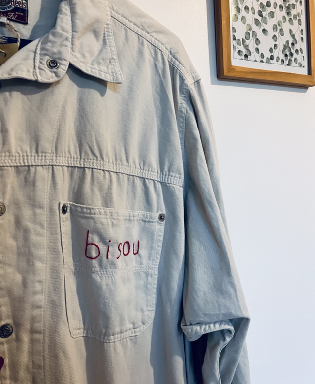 Pièce unique réalisée à partir d’un vêtement vintage soigneusement chiné et sélectionné 1 par 1 . Chaque création est entièrement brodée à la main, ce qui la rend singulière et non reproductible. Le vêtement est issu de l’upcycling : il a été revalorisé dans une démarche responsable, en lui offrant une seconde vie à travers un travail textile artisanal. De légères traces du temps peuvent être présentes et font partie intégrante de son histoire et de son authenticité.
